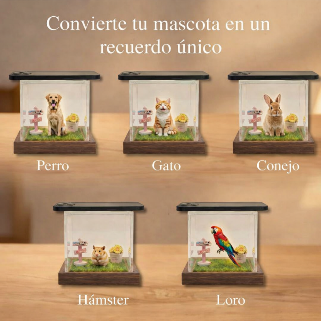 Coloca tu teléfono encima de la caja, activa el holograma y observa cómo tu mascota vuelve a moverse delante de ti. Luz, movimiento y presencia real.