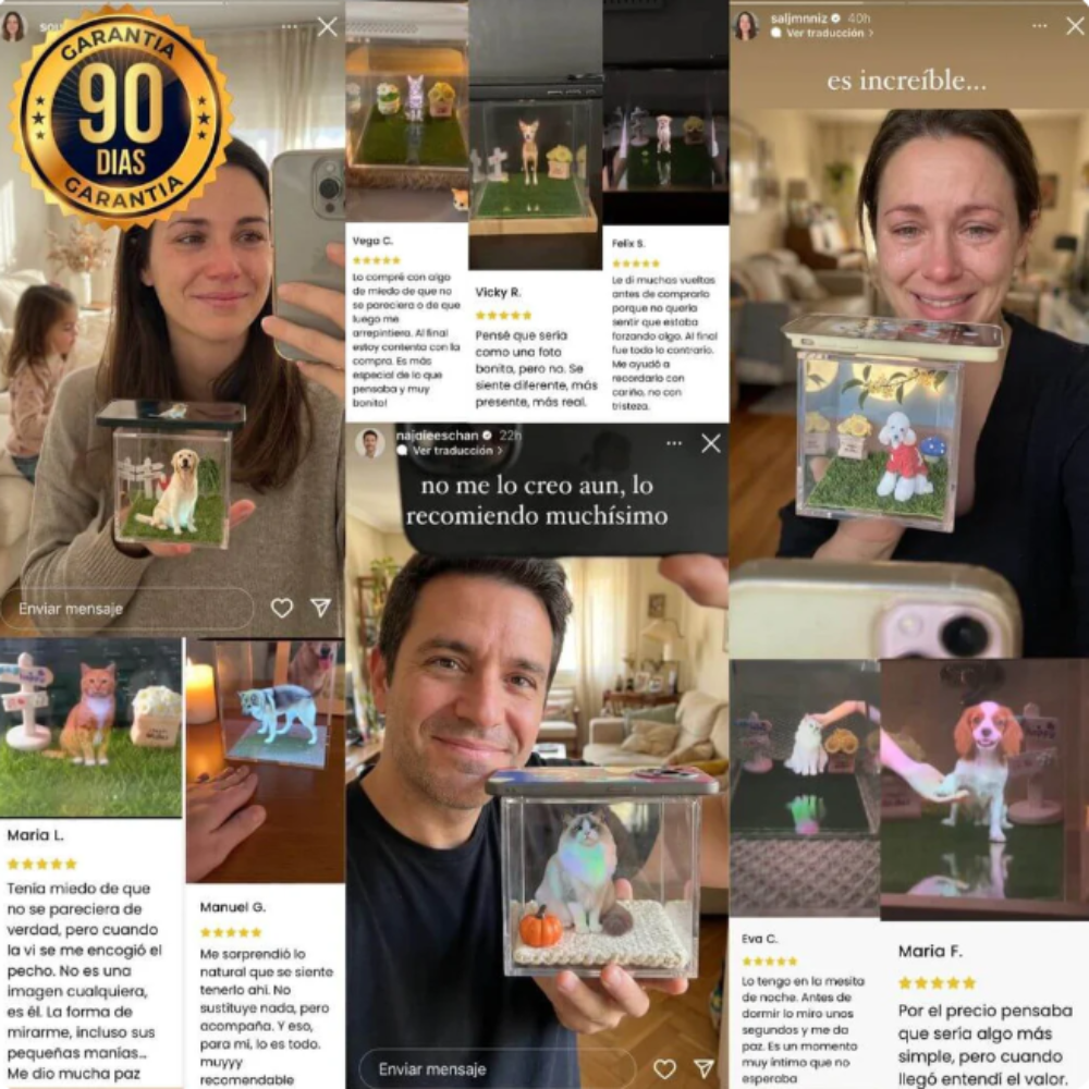 Escanea el código QR, sigue los pasos simples y crea tu holograma en minutos. Solo necesitas 1-2 fotos claras de tu mascota.